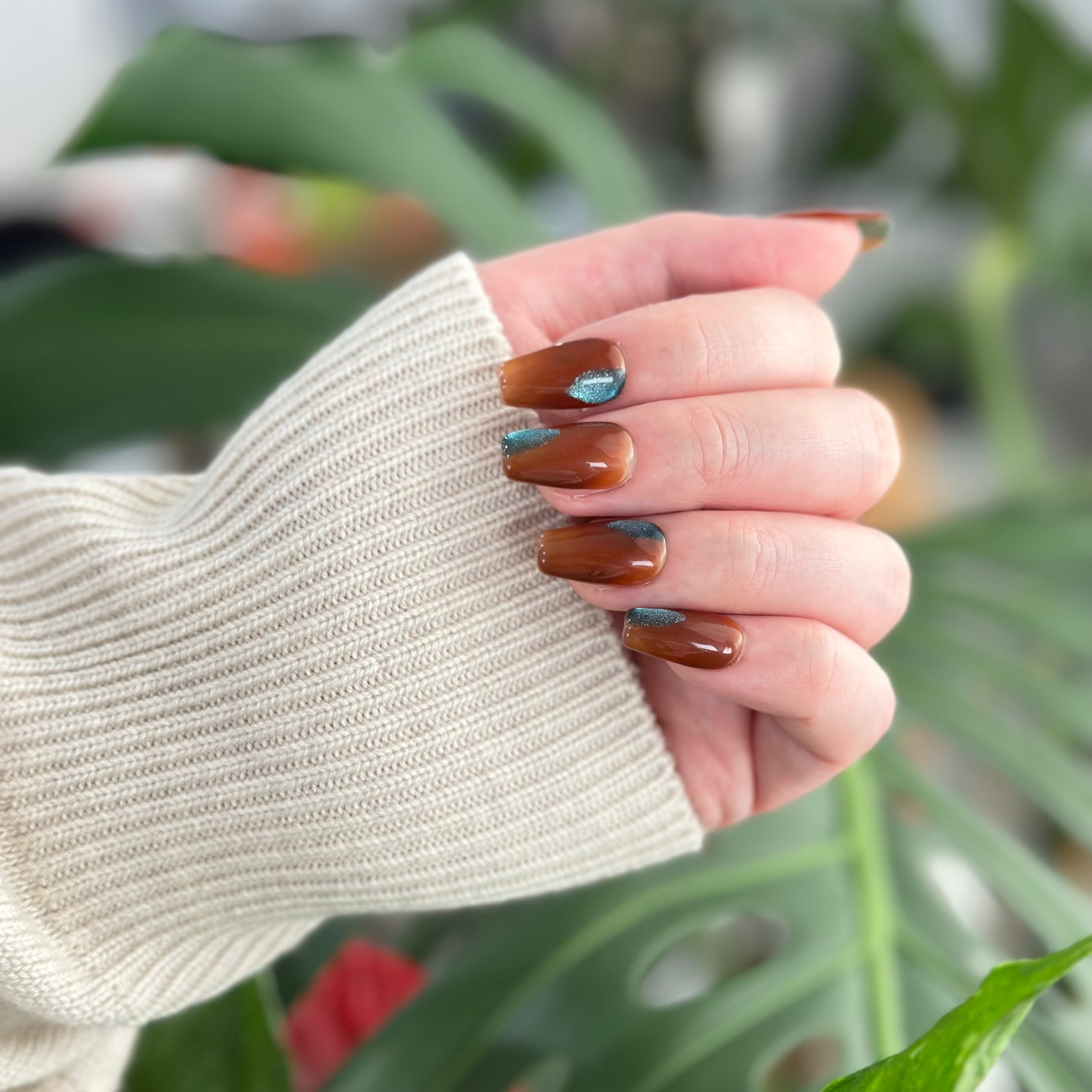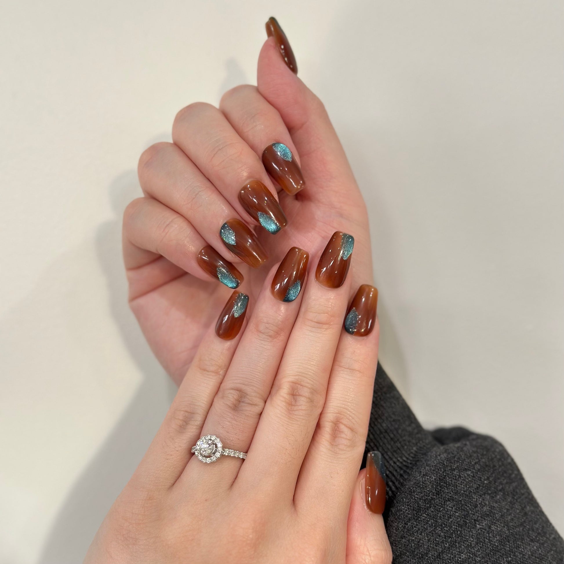 These press - on nails showcase a chic and modern design. They have a rich, glossy brown base that resembles polished amber. Accenting this are patches of shimmering teal with a glittery finish, applied in various shapes—some at the tips, others as diagonal or irregular splotches.