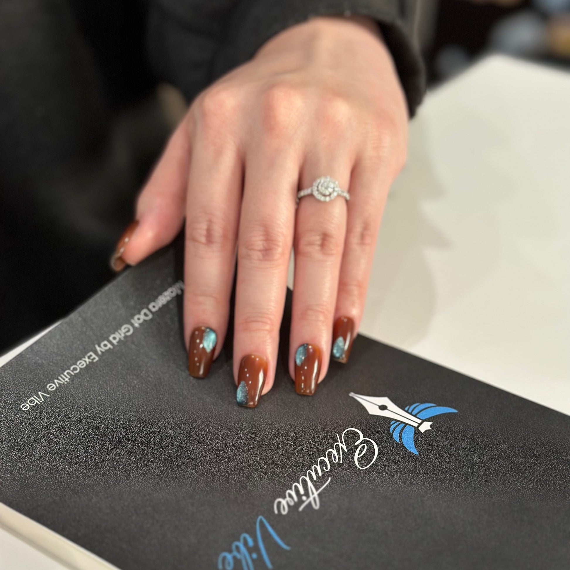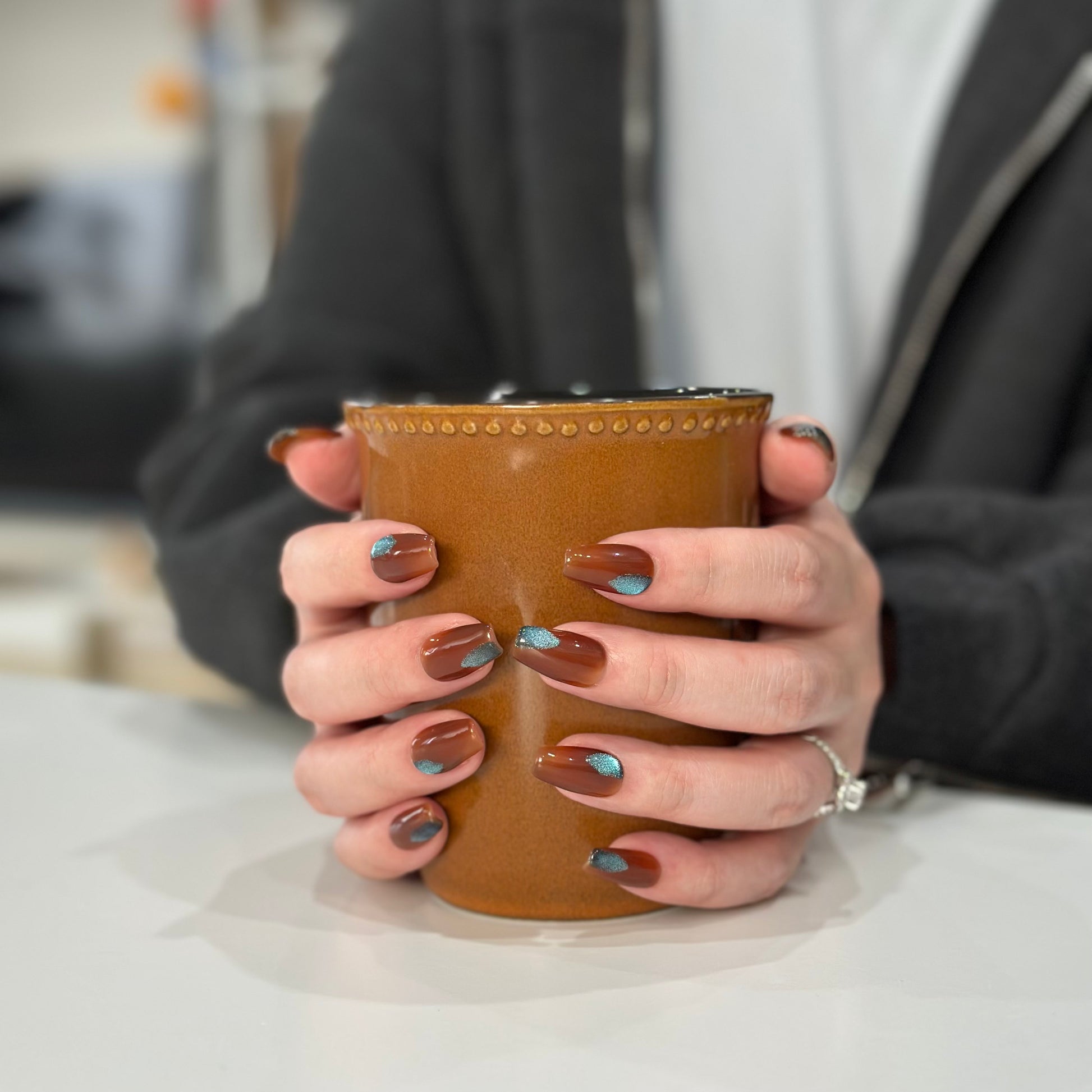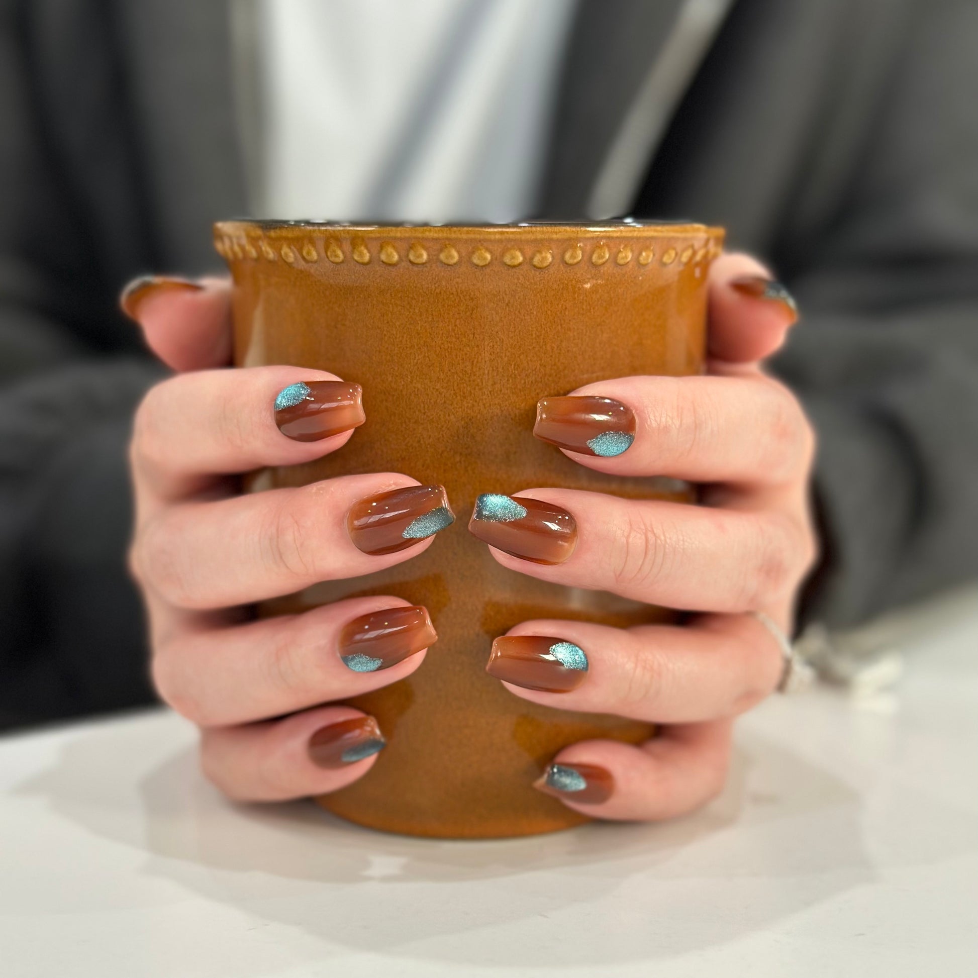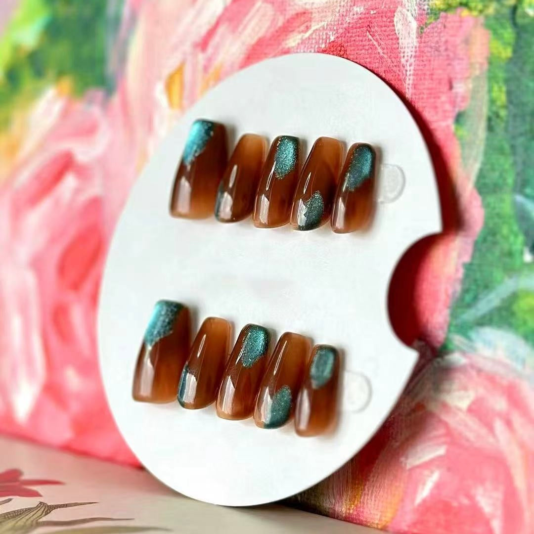 The contrast between the warm brown and cool teal is striking, creating a visually appealing balance. The glossy texture of the brown combined with the sparkly teal adds depth and a touch of glamour. Perfect for those who want a stylish yet understated nail look, these press - on nails can effortlessly elevate both casual and more formal outfits, bringing a unique and trendy vibe to one's overall appearance.