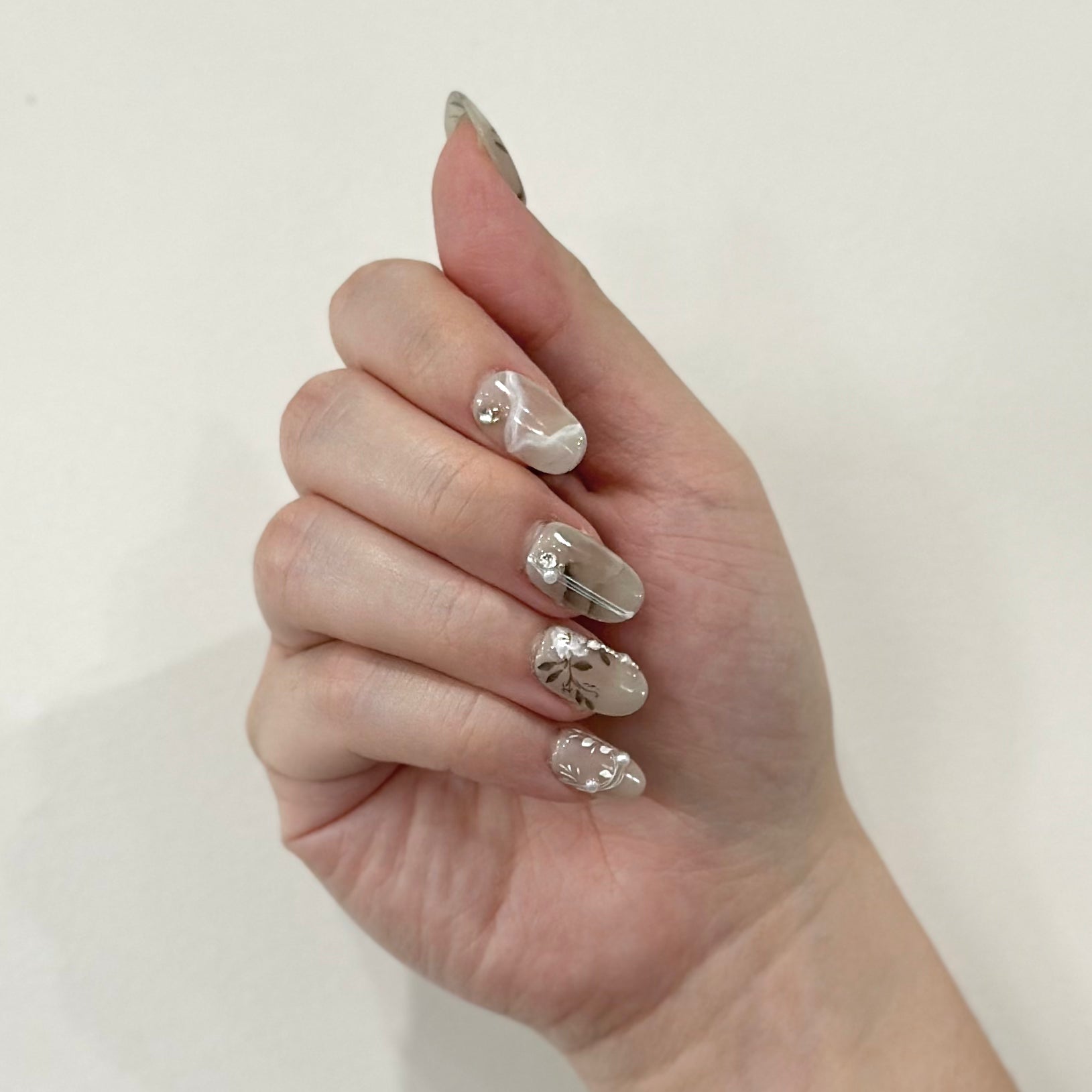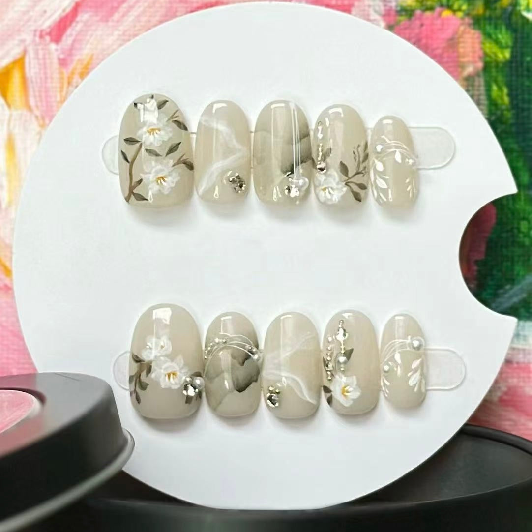Intricate floral patterns are painted on the nails, with delicate white flowers and subtle green leaves adding a touch of natural beauty. Some nails feature swirling, marble - like textures in gray shades, enhancing the sense of artistry. There are also nails adorned with tiny silver and pearl - like embellishments, which catch the light and add a hint of sparkle.