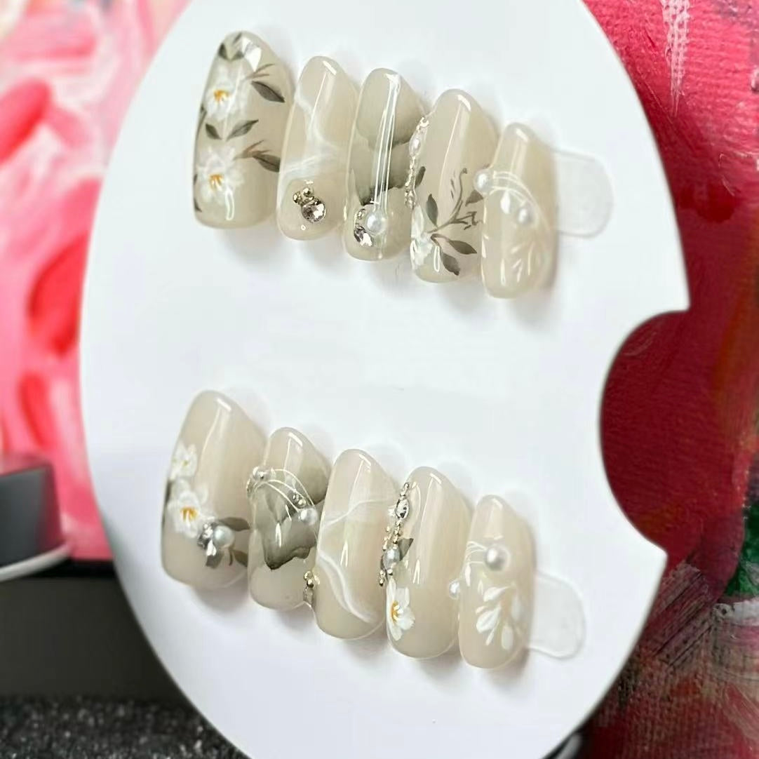 The overall look is sophisticated and feminine, perfect for adding a touch of grace to any outfit, whether for a formal event or daily wear. Each nail is meticulously crafted, making this set a beautiful choice for those who appreciate delicate and stylish nail art.
