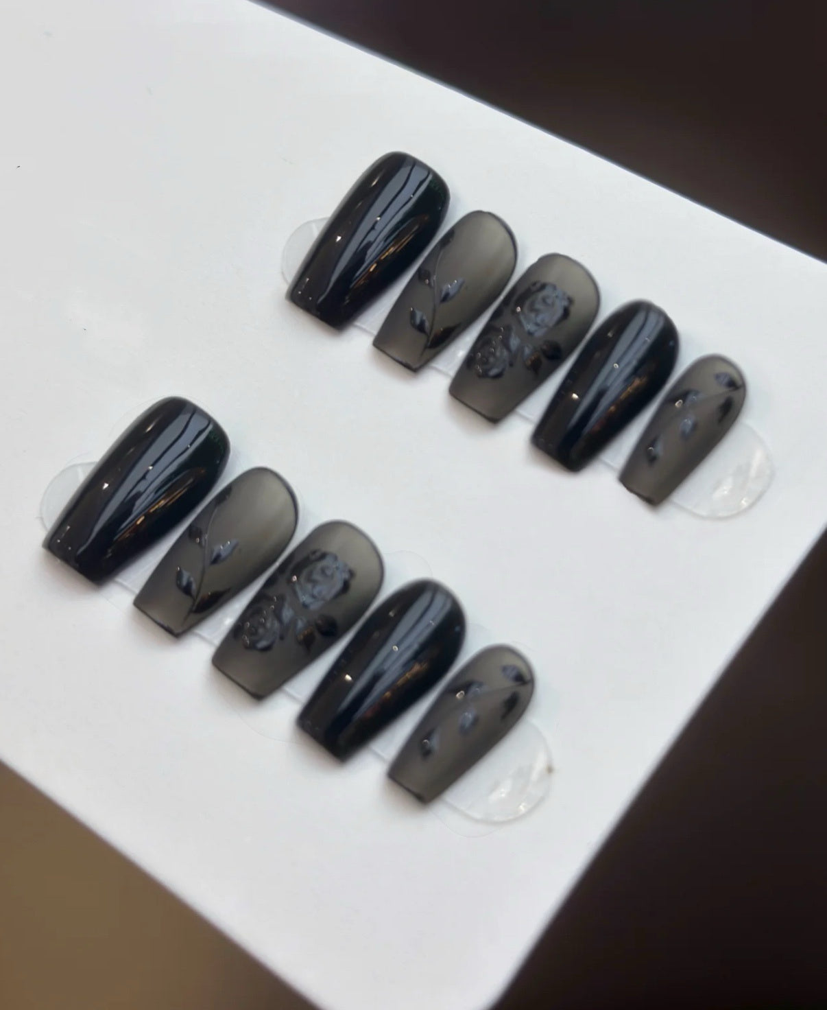 These press-on nails embody sophisticated dark romance. Predominantly black, they feature a captivating interplay of textures: some are high-gloss for dramatic shine, while others boast a luxurious matte finish. The true artistry lies in the intricate 3D carvings – elegant roses and delicate leaves meticulously sculpted onto select nails, adding striking dimension and floral elegance. This design masterfully blends gothic allure with refined beauty. These nails are an ideal choice for those seeking a stylish, statement-making look that exudes mystery and timeless chic.