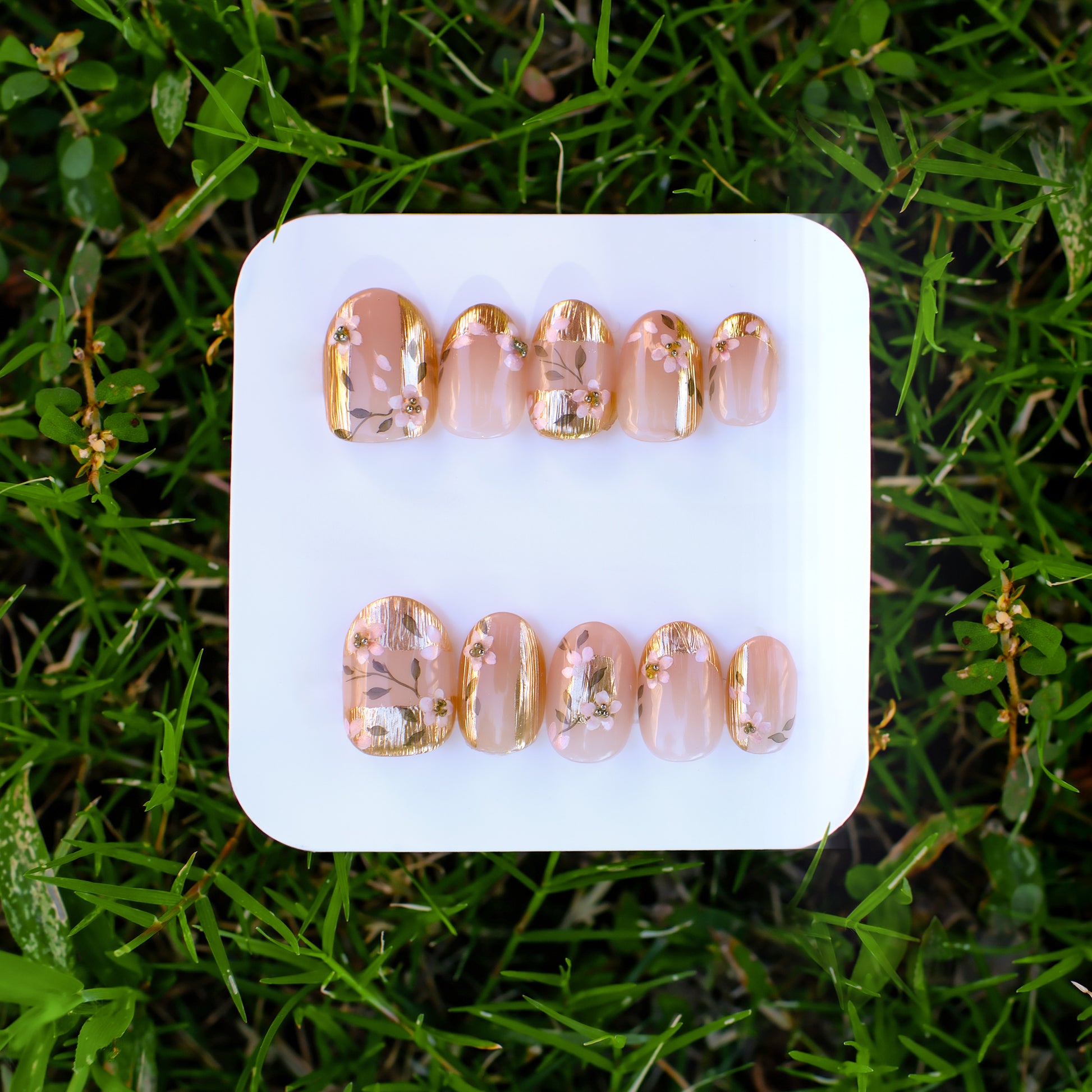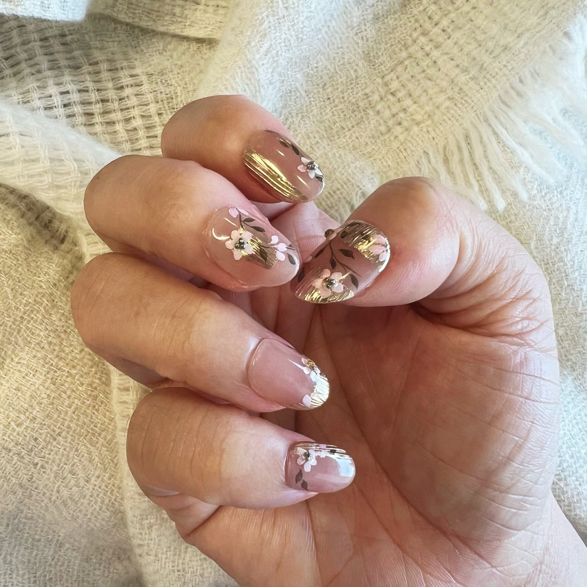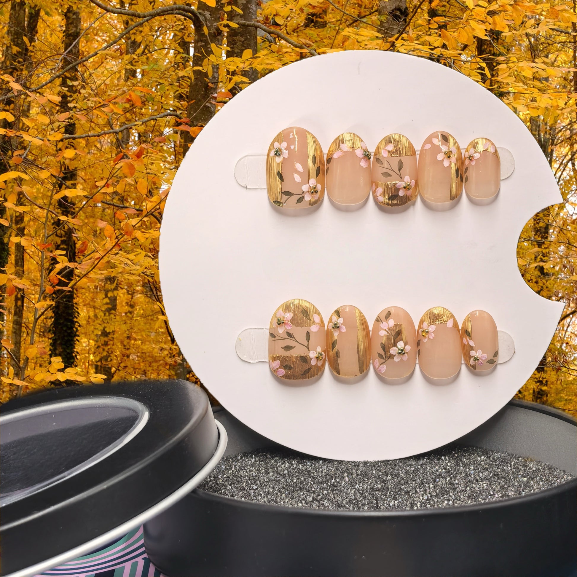 These press - on nails exude an autumnal charm. They feature a soft nude base, complemented by shiny gold accents. Delicate pink floral patterns with tiny green leaves are painted on, some overlapping with the gold for a rich, layered look.