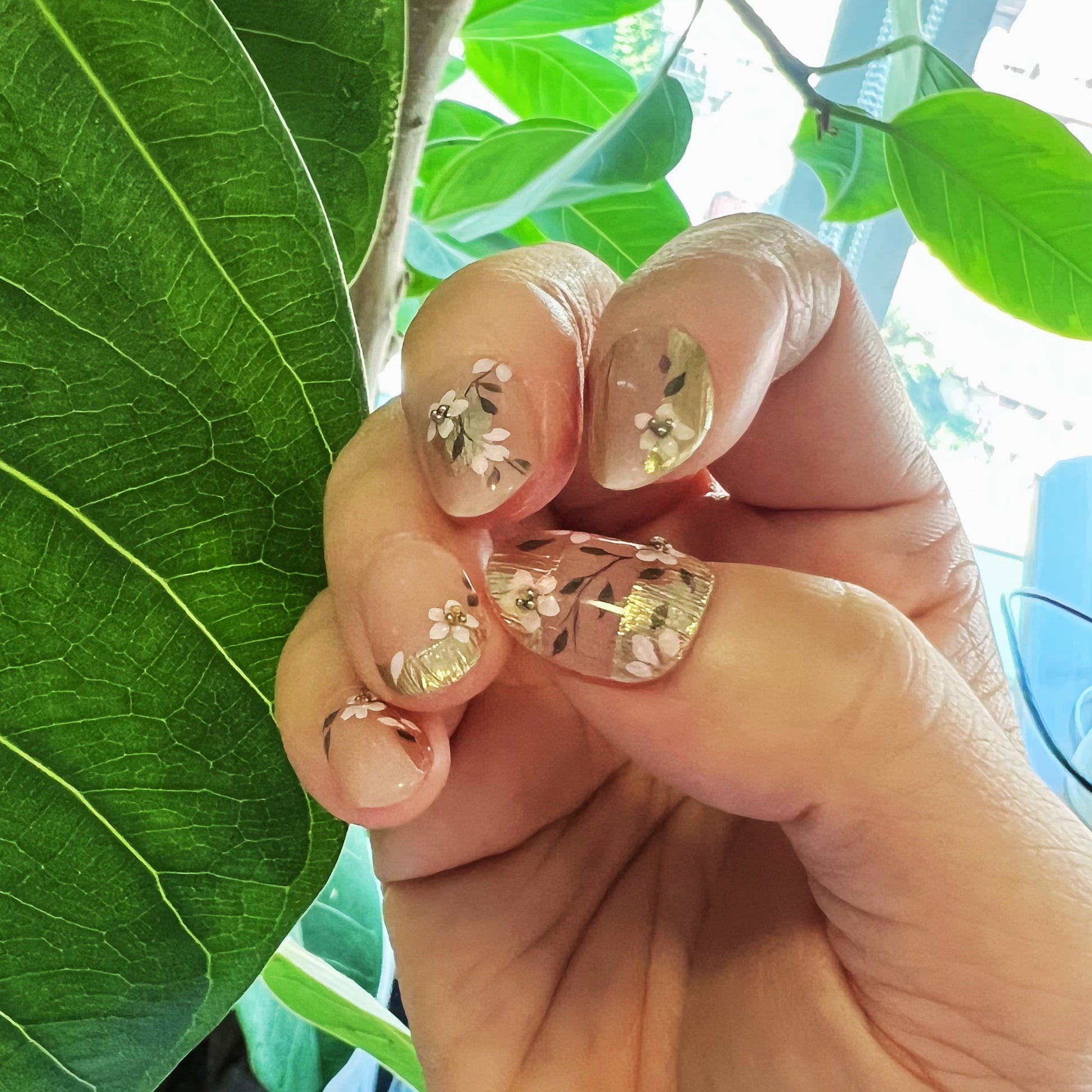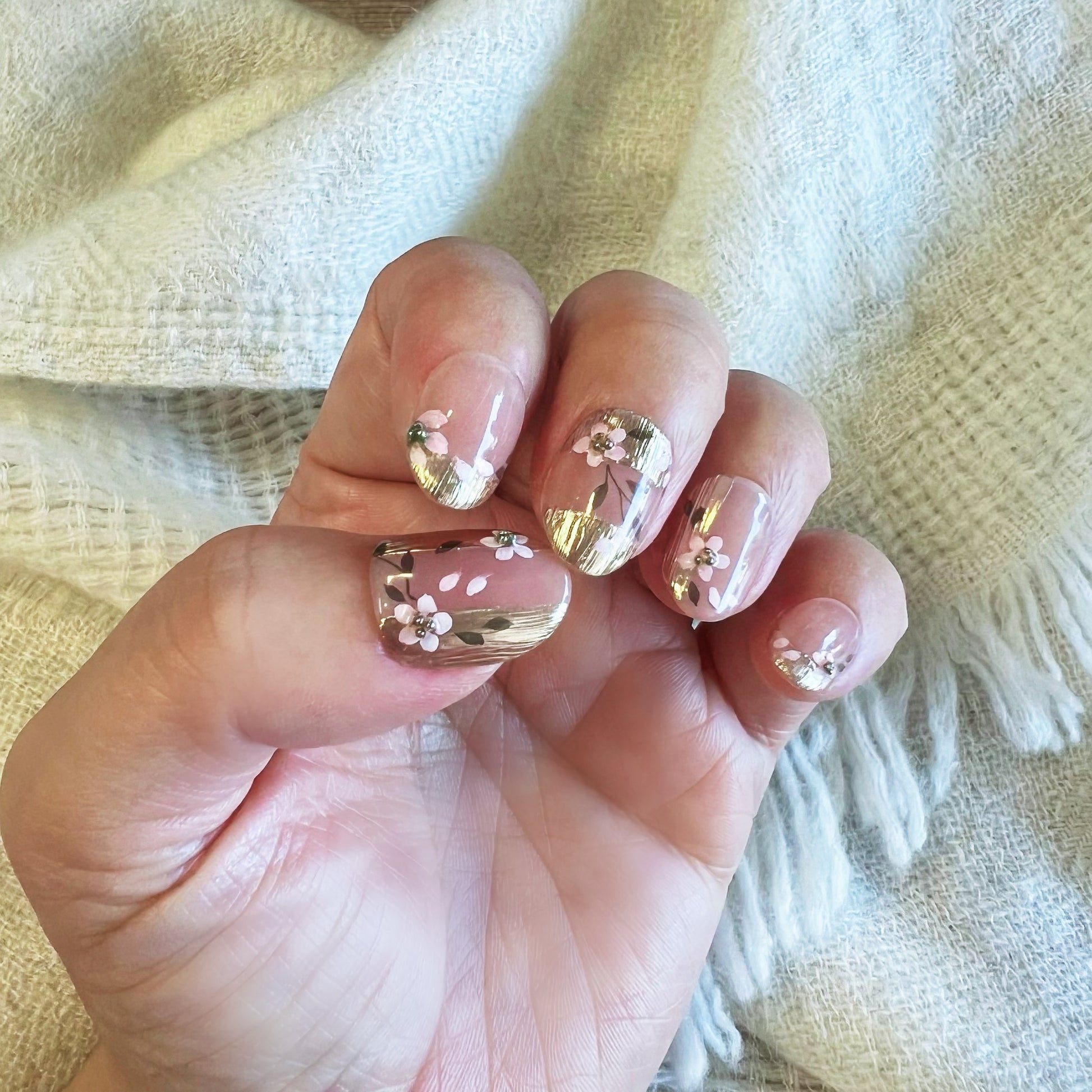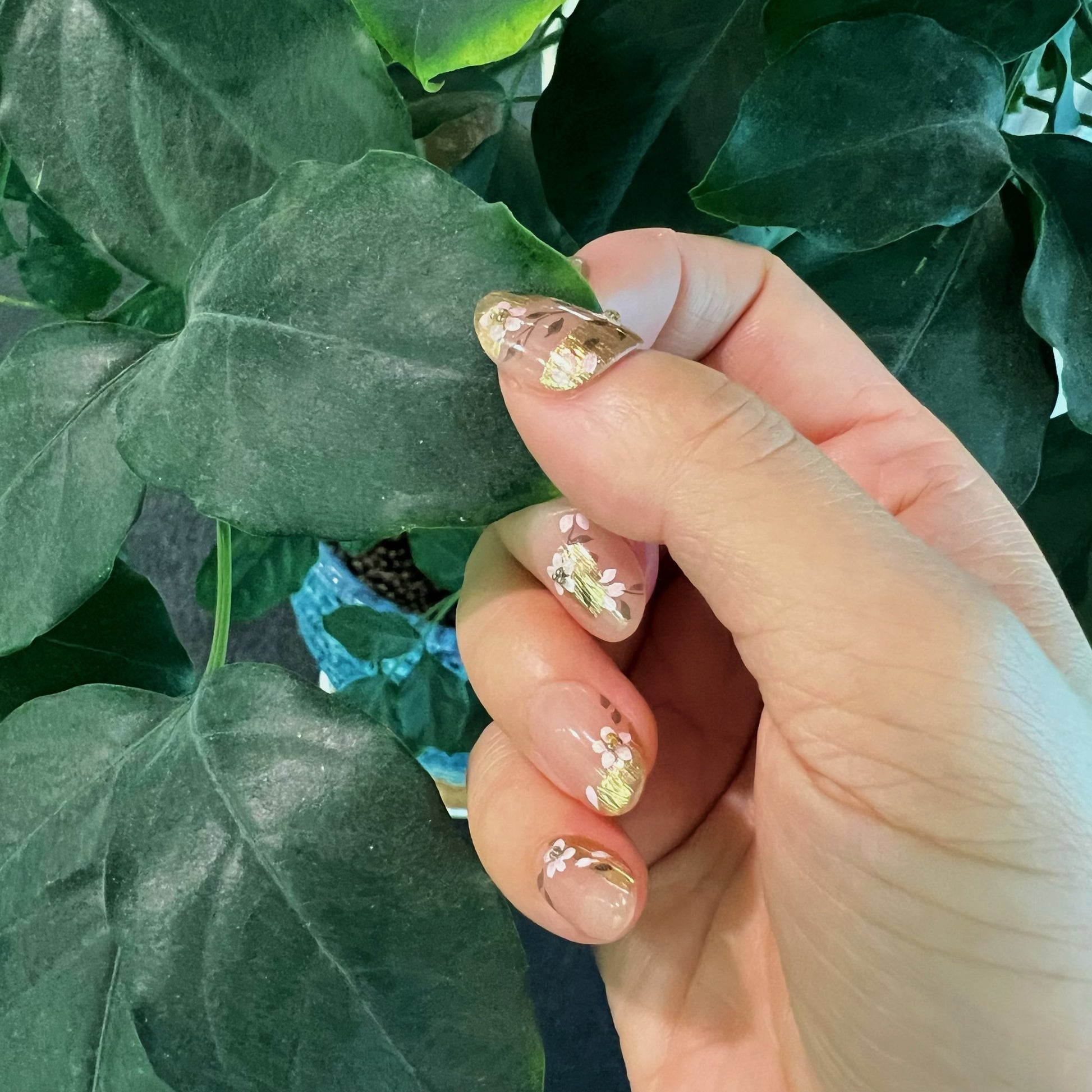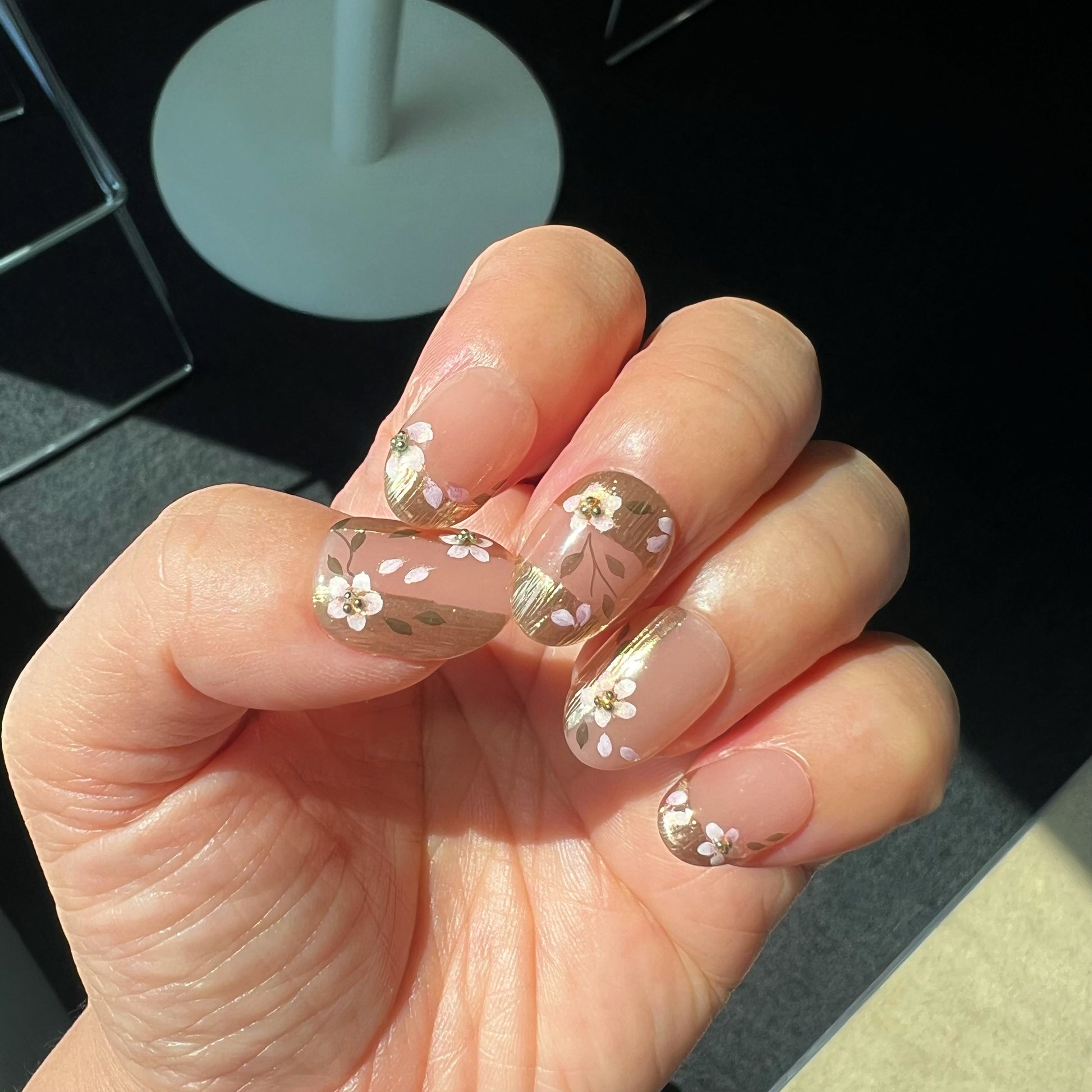 These press - on nails exude an autumnal charm. They feature a soft nude base, complemented by shiny gold accents. Delicate pink floral patterns with tiny green leaves are painted on, some overlapping with the gold for a rich, layered look.
