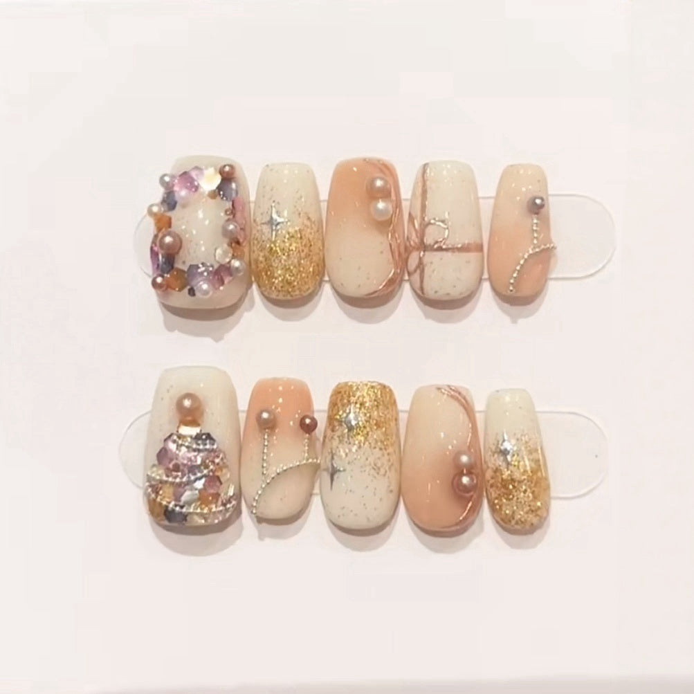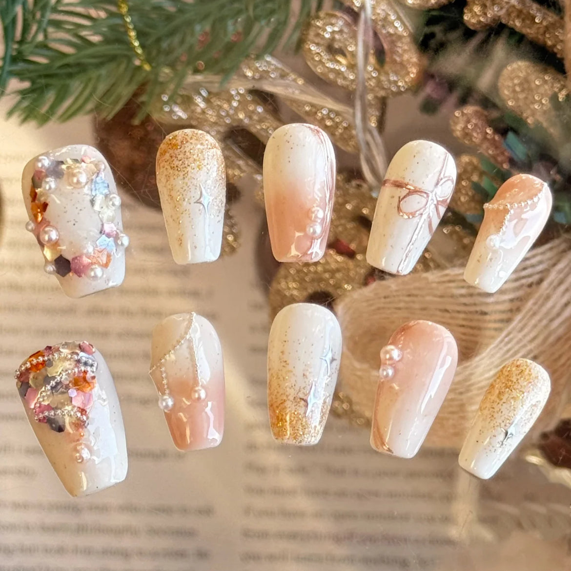 Featuring a dreamy palette of soft creams and peaches, they’re adorned with gold glitter, dainty pearls, colorful embellishments, and cute bow details. Handcrafted with meticulous care, each nail boasts a glossy finish and 3D accents, embodying festive charm and elegant artistry. Perfect for adding a touch of whimsical glamour to your Christmas look, they’re a standout choice for holiday celebrations.