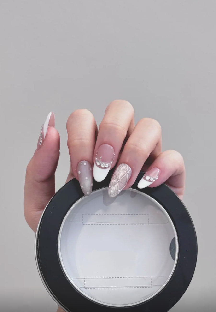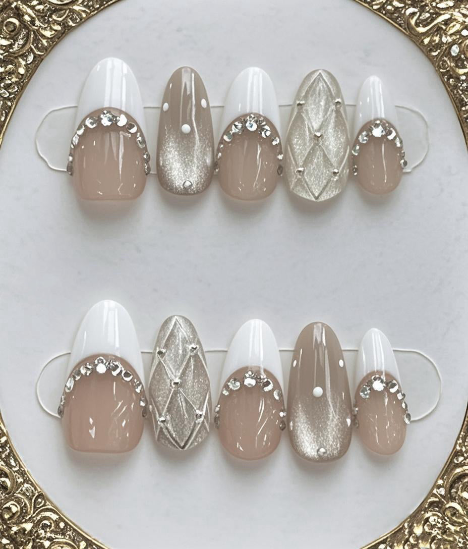 This set features elegant press-on nails in a sophisticated nude-and-white color palette. Each of the five nails displays delicate variations: some boast a classic sheer nude base with crisp white tips, while others incorporate a nude foundation adorned with intricate silver geometric patterns and playful white polka dots. A key highlight is the artful placement of shimmering rhinestones along the white-tipped edges, adding subtle glamour. The nails’ minimalist yet refined designs - combining neutral tones, metallic details, and sparkling accents - are showcased with clarity. This versatile set offers both timeless French-manicure charm and modern decorative flair.