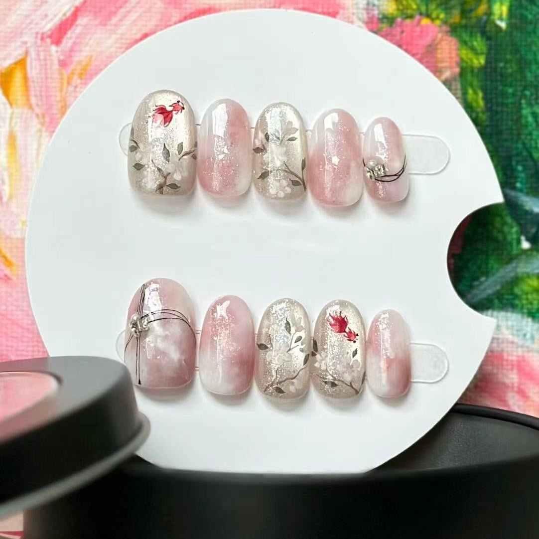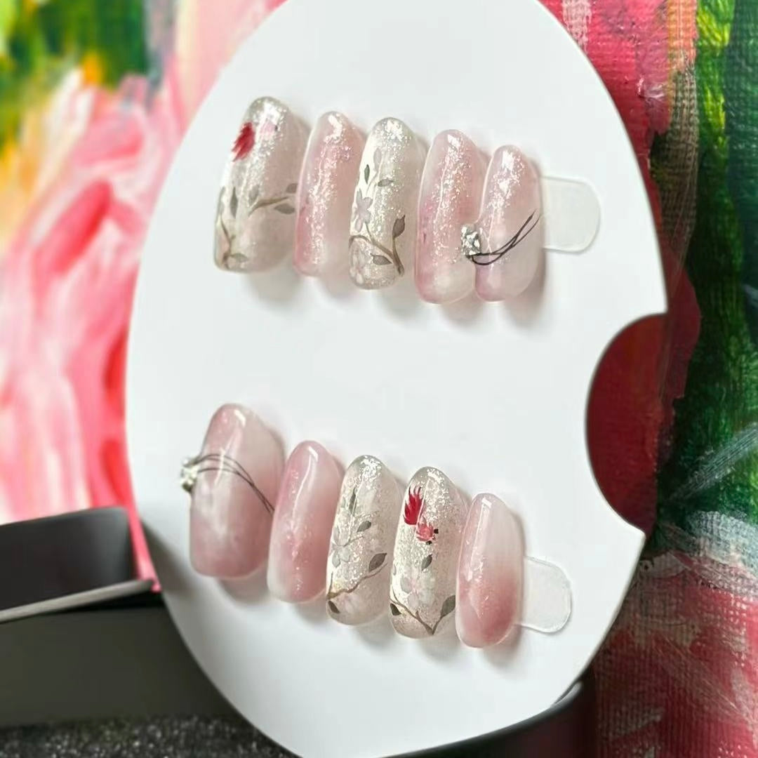 Intricate floral and leaf patterns are painted on several nails, along with small, vivid red flower accents that bring a lively touch. There are also nails adorned with thin black lines and tiny decorative elements, enhancing the sense of detail. The overall design is elegant and feminine, perfect for adding a gentle and stylish flair to one's look, whether for daily wear or special occasions. Each nail is meticulously crafted, making this set a beautiful choice for nail art lovers.