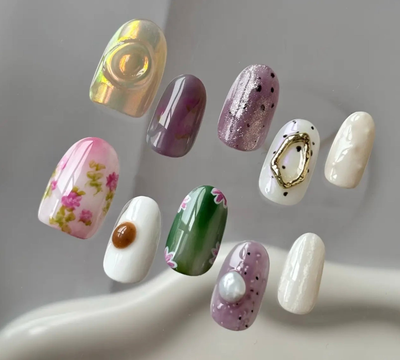 This collection showcases beautifully designed press-on nails offering versatile instant glamour. Featuring a soft palette including pastel pink, mint green, lilac purple, and crisp white, they cater to varied tastes. Intricate details define them: delicate hand-painted floral patterns adorn some, while others are elegantly embellished with lustrous pearls or sleek, eye-catching golden geometric accents. The nails highlight their intricate textures and fine craftsmanship. Combining modern chic with classic elements, these press-ons deliver sophisticated salon-style results effortlessly. Ideal for daily wear or special occasions, they provide an easy, customizable solution for fashionable, creative nail expression.