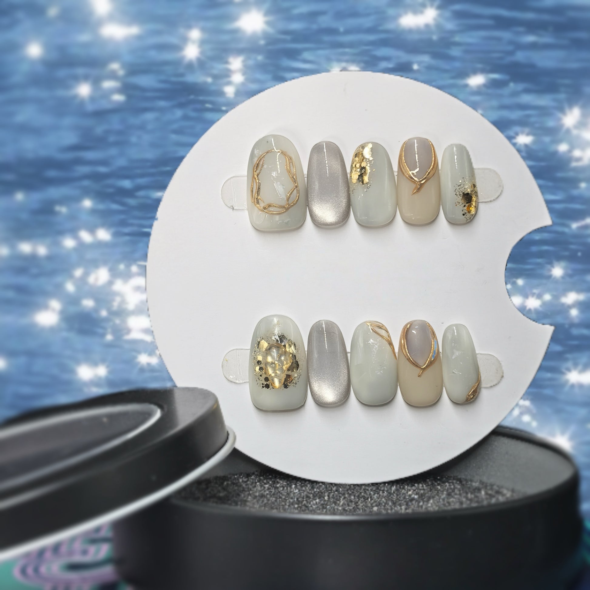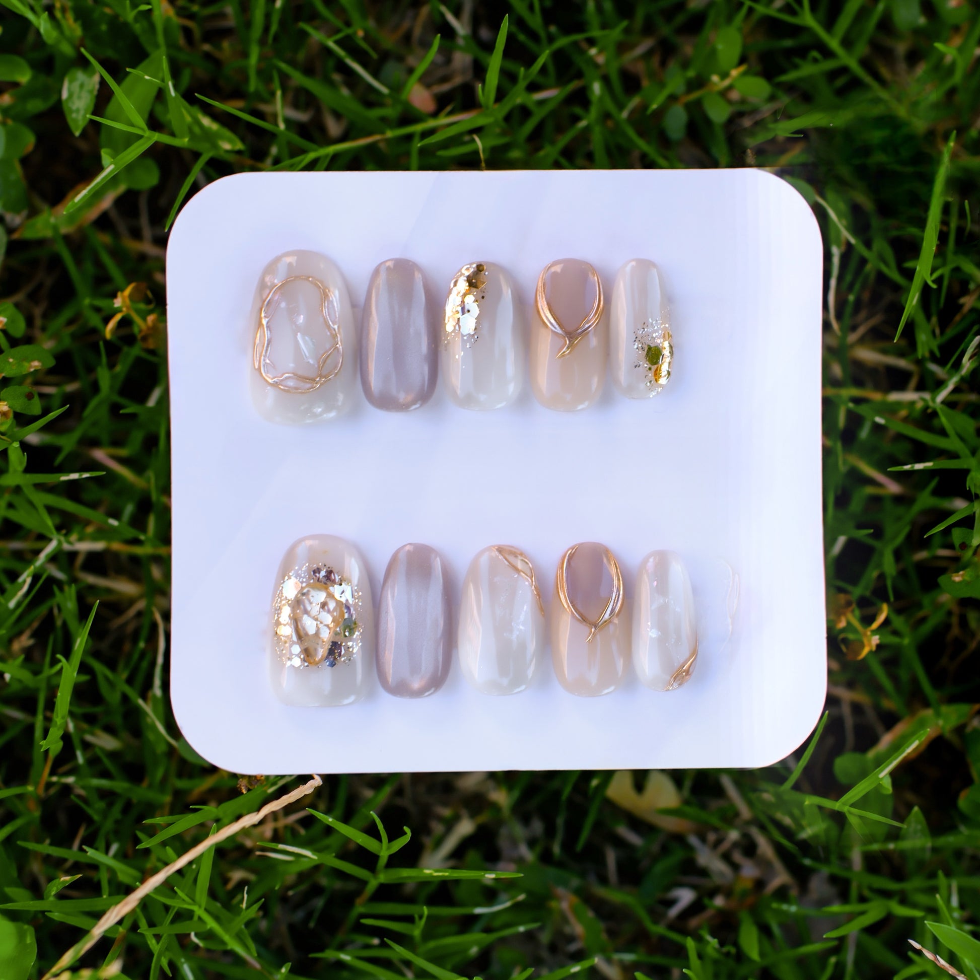 These press - on nails exhibit an elegant and sophisticated style. They utilize a palette of soft, neutral tones such as light gray, off - white, and beige. Some nails are decorated with delicate gold wire patterns, which add a touch of luxury.