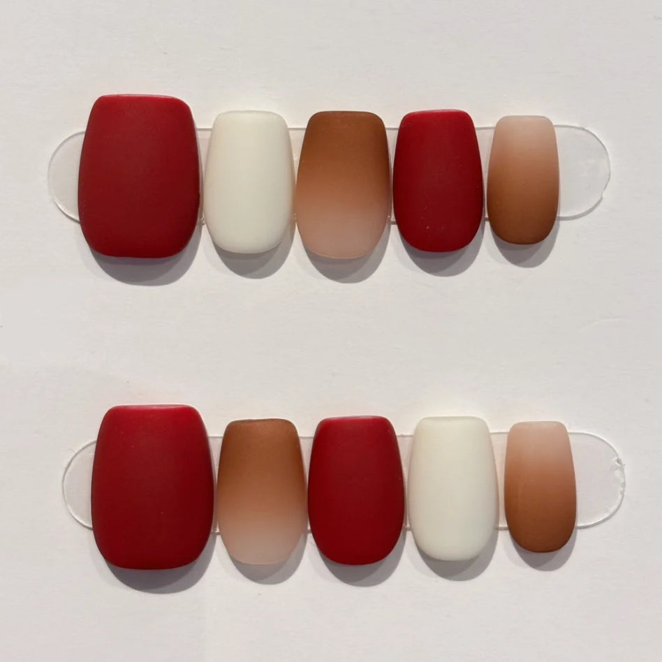 These press-on nails have a matte finish and feature a combination of colors: bold red, pure white, and gradient brown (from deep to light). The design is simple yet stylish, with each nail showcasing either a solid color or a smooth gradient. The overall look is elegant and versatile, suitable for both casual and formal occasions, adding a touch of sophistication to your hands.