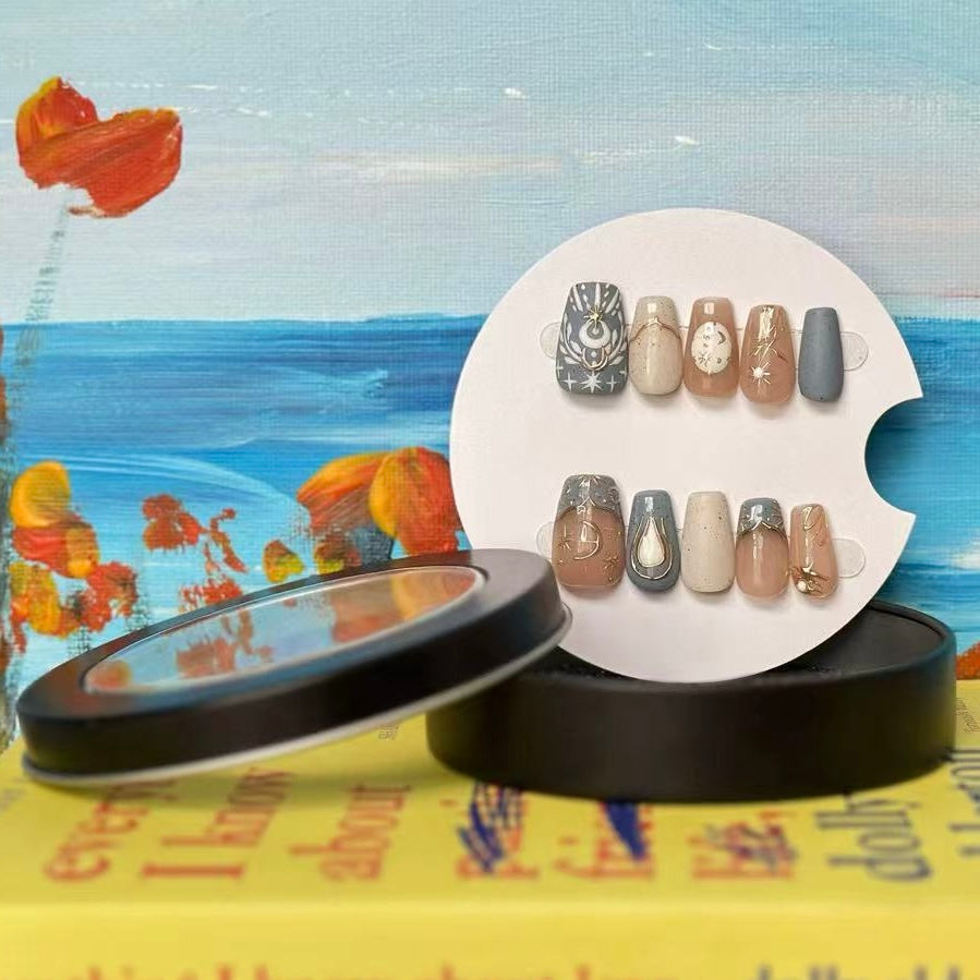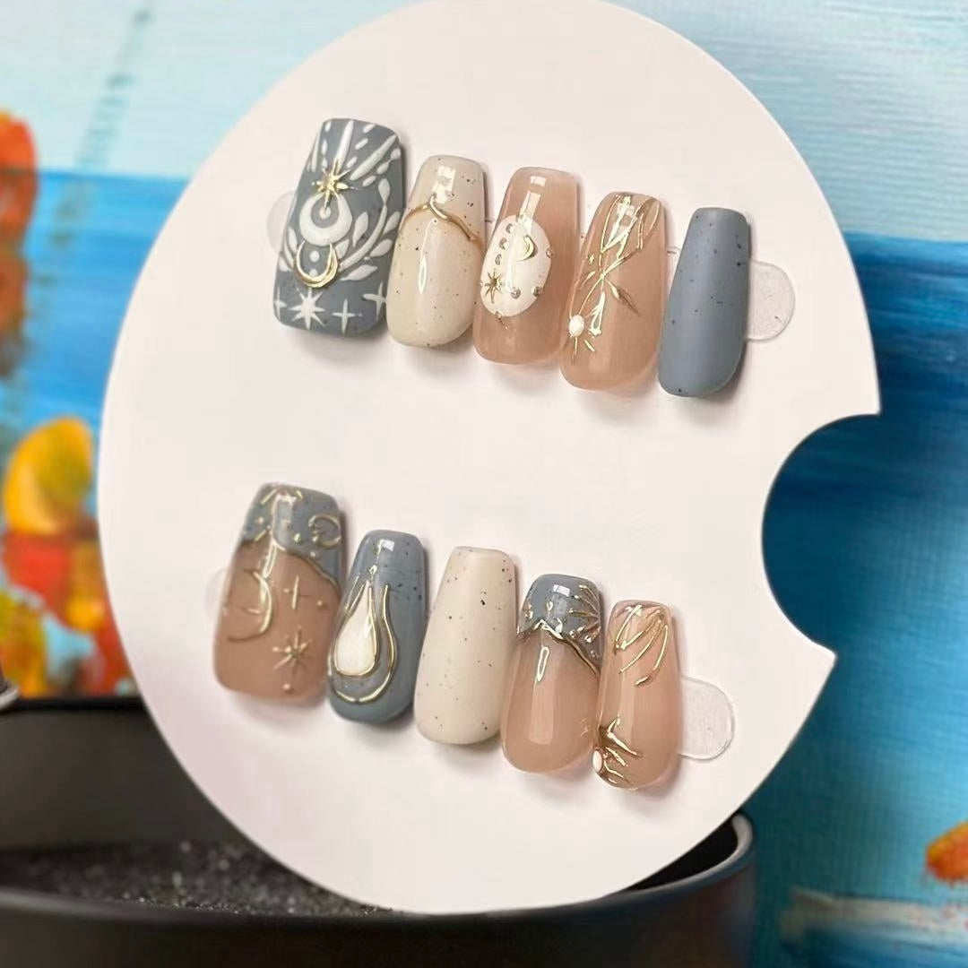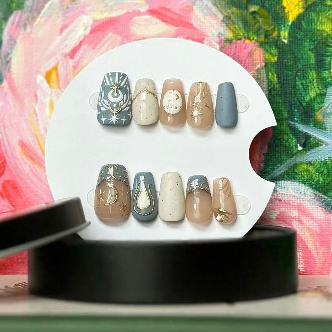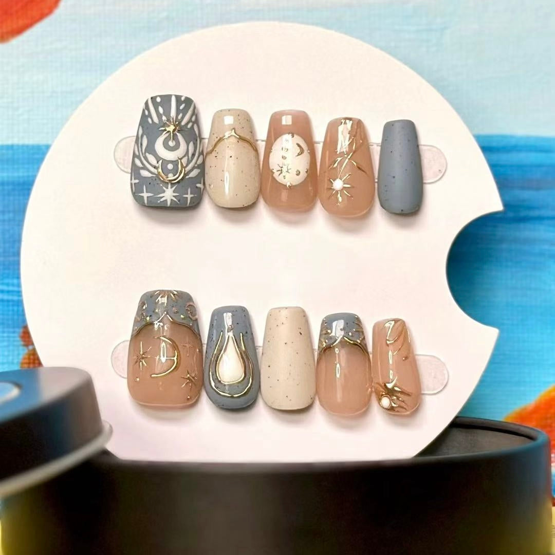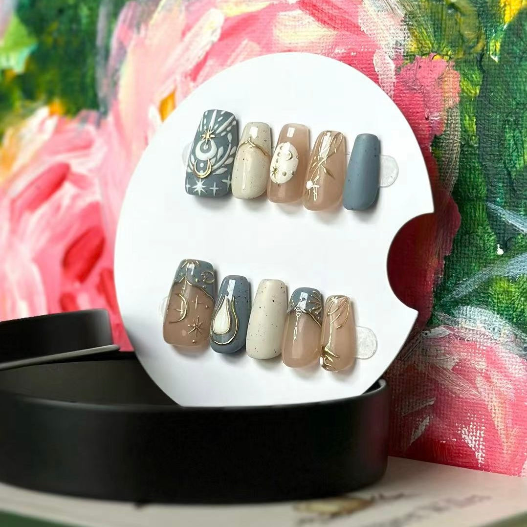 These press - on nails boast a celestial theme, exuding an air of elegance and mystery. They utilize soft tones like light brown, gray, and beige, creating a gentle and harmonious color palette.