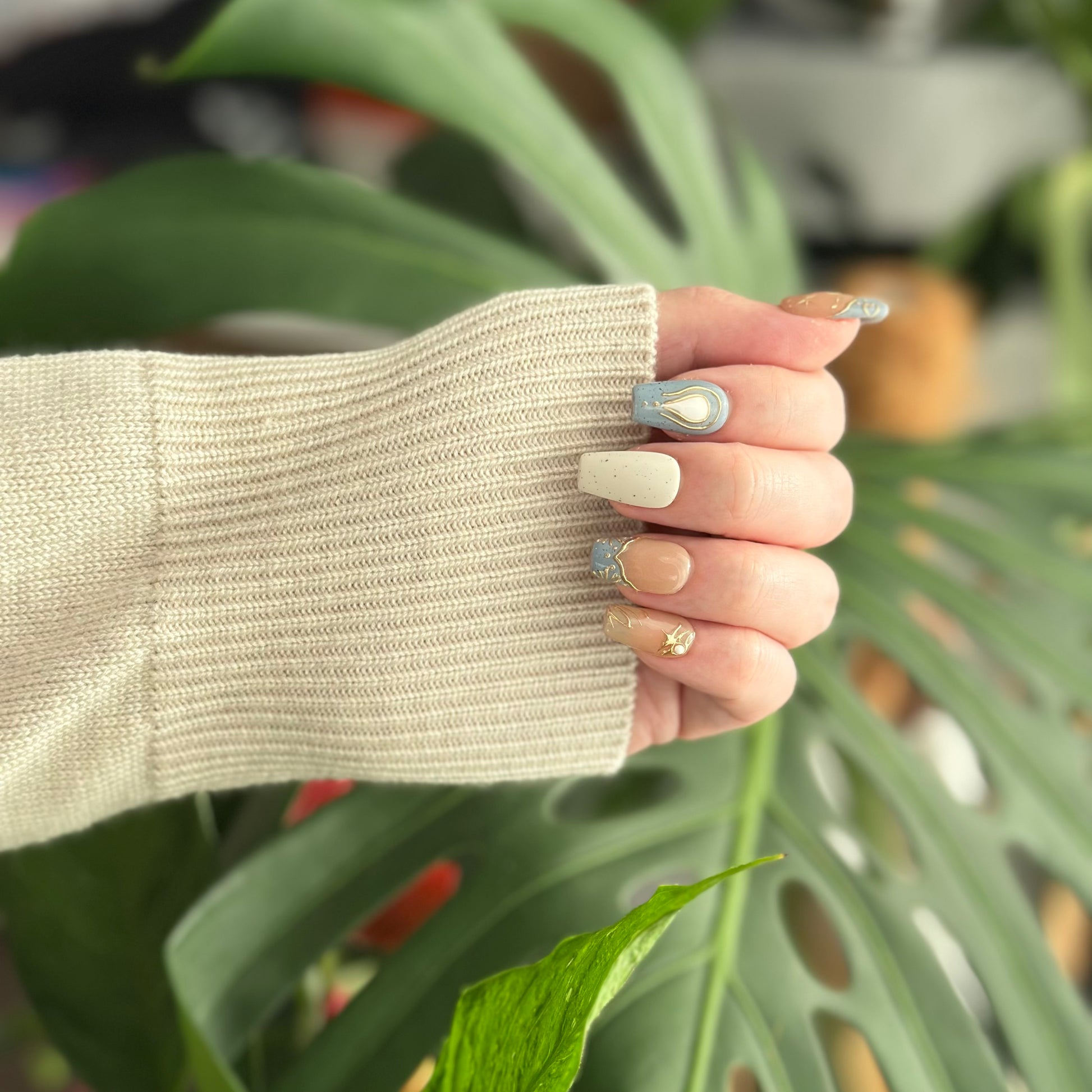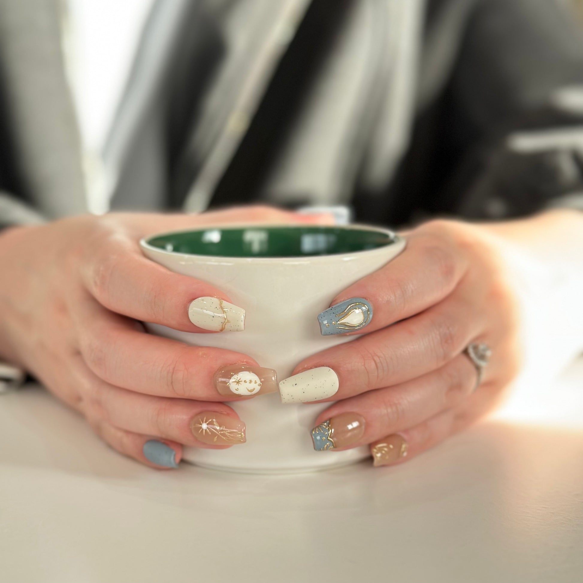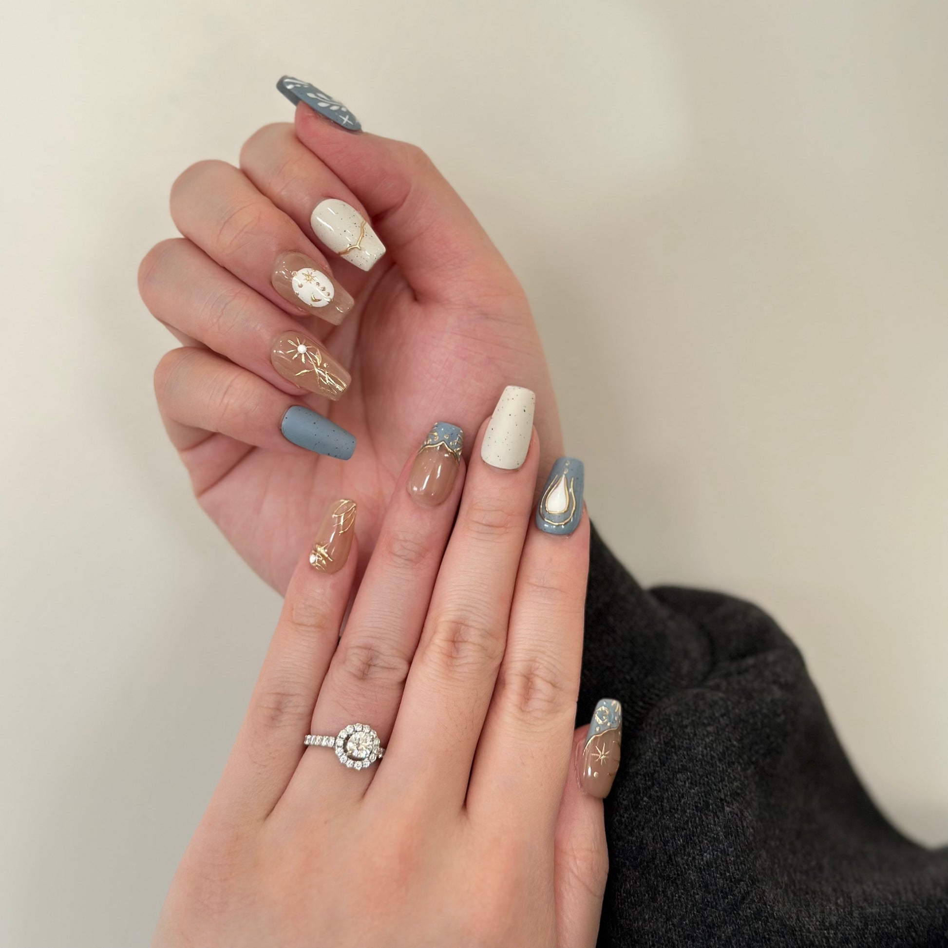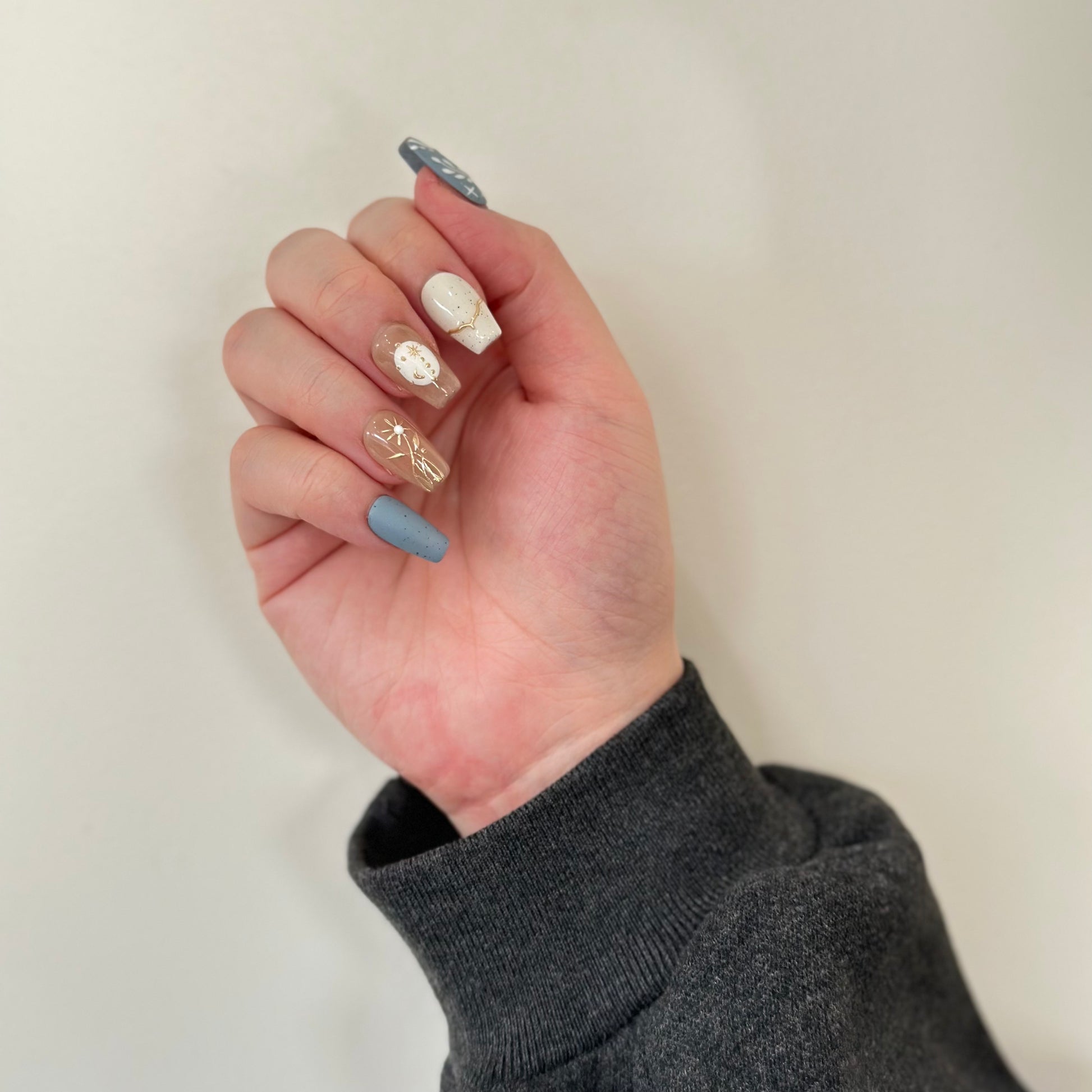 These press - on nails boast a celestial theme, exuding an air of elegance and mystery. They utilize soft tones like light brown, gray, and beige, creating a gentle and harmonious color palette.