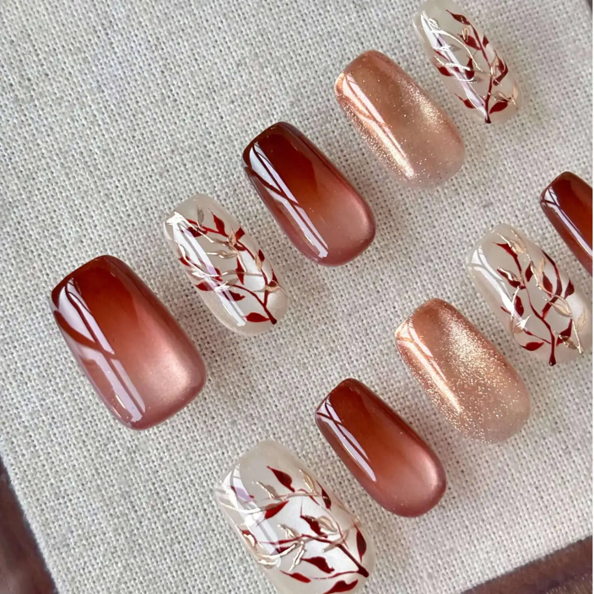 These press-on nails showcase an elegant autumn-inspired design. They feature gradients of deep brown to light beige, with some nails having a shimmery champagne finish. Intricate red and gold leaf patterns adorn the clear nails, adding a touch of artistry and sophistication. The overall look is warm, refined, and perfect for bringing a stylish autumnal vibe to any outfit.