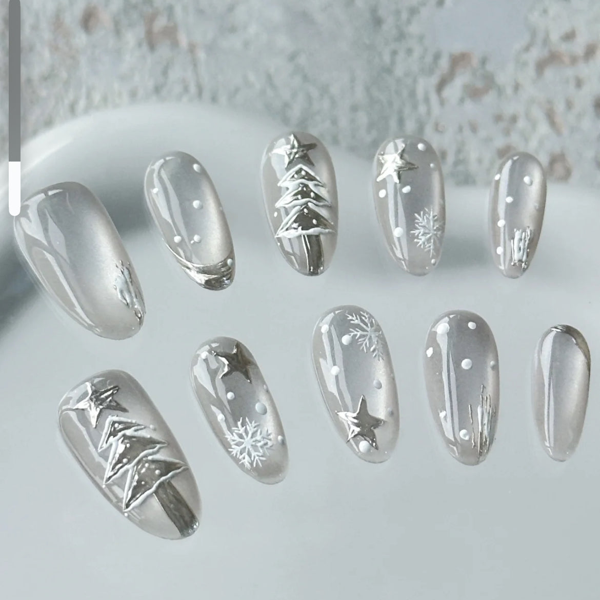 Featuring a sleek silver-toned design with a translucent base, they showcase intricate details like 3D Christmas trees, stars, snowflakes, and delicate white dots. The glossy finish adds a touch of elegance, perfectly capturing the magical, wintry charm of the holiday season. Handcrafted with precision, they’re an ideal choice for adding a sophisticated, festive flair to your Christmas look.